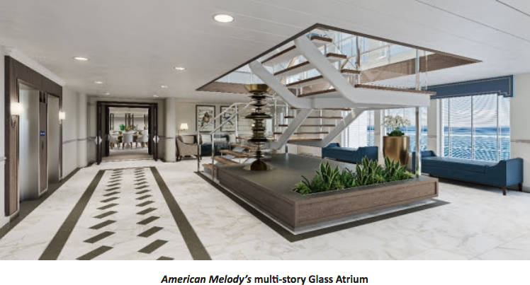 The American Melody and her sister ships feature 5 decks of eye-catching architectural details like a grand, multi-story glass atrium at the center of the ship, a patented opening bow and retractable gangway, elevator access to all decks for accessibility and ease, and sweeping expanses of glass throughout with unparalleled panoramic views both inside and out.